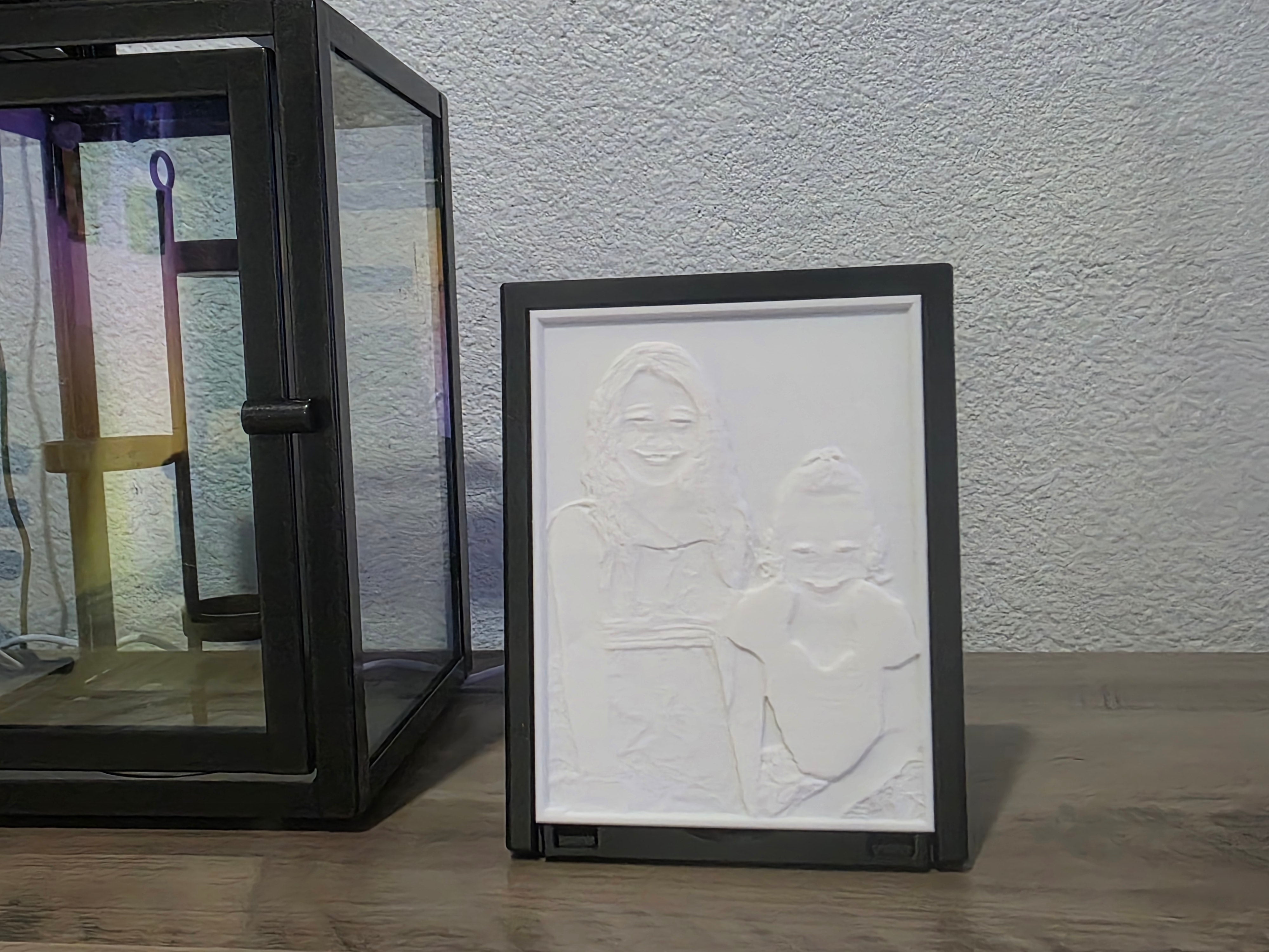 The lithophane is housed in a durable, minimalist frame designed to complement any décor. The frame includes a built‑in LED backlighting system that provides even, energy‑efficient illumination without generating excess heat. A matching power supply is included, making the piece ready to display right out of the box—no assembly required.